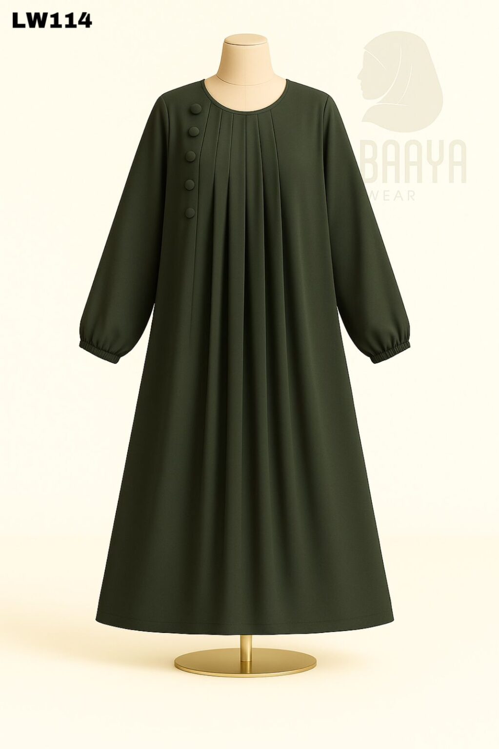 Bring subtle elegance into your wardrobe with the Olive Pleated Button Abaya. This front-pleated design is adorned with four statement buttons on the left shoulder, adding a contemporary flair to a traditional silhouette. With its gathered sleeves and flattering fall, this abaya blends style and simplicity—perfect for both everyday wear and refined outings.